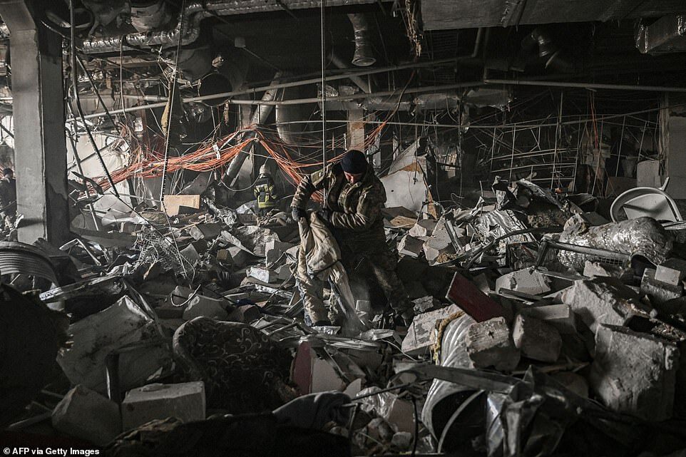 At least six people were killed in the overnight bombing of a shopping centre in the Ukrainian capital Kyiv, on Monday (pictured, a Ukrainian service member searches through the rubble for survivors)
