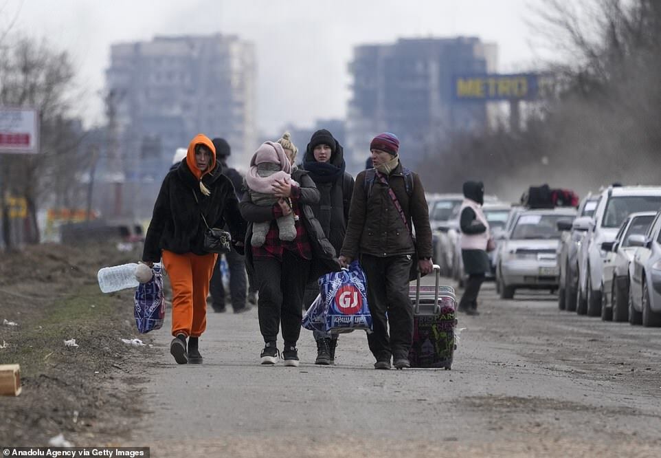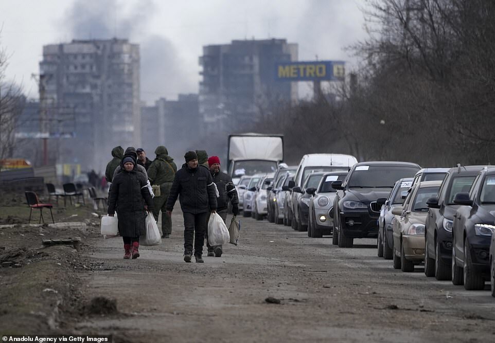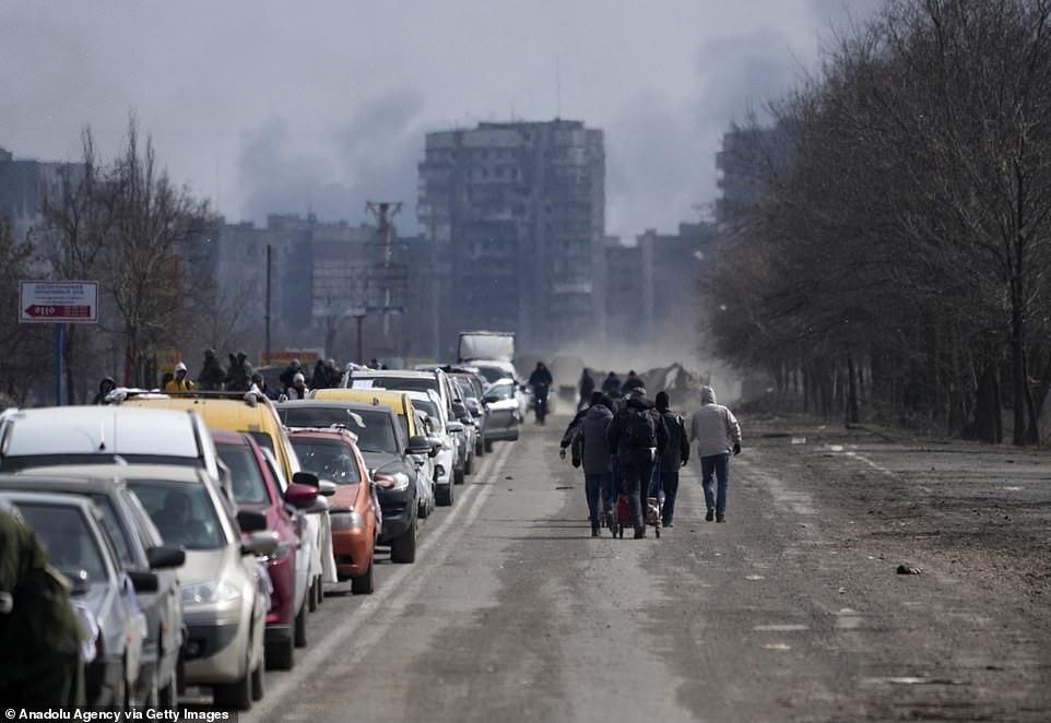 Mariupol is in the throes of a humanitarian emergency after being encircled by Russian troops, cut off from energy, food and water supplies and facing a relentless bombardment (pictured, civilians flee the city on Sunday)