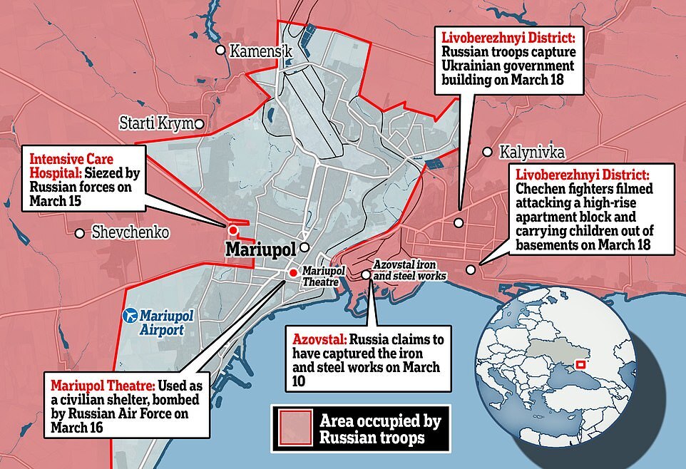 Mariupol has been surrounded by Russian forces for two weeks, which are now trying to push into the city. If it falls, it would be the biggest city captured by Russian troops so far, and would open up a 'land corridor' from rebel-held areas of Donbass to Crimea for reinforcements to pass along