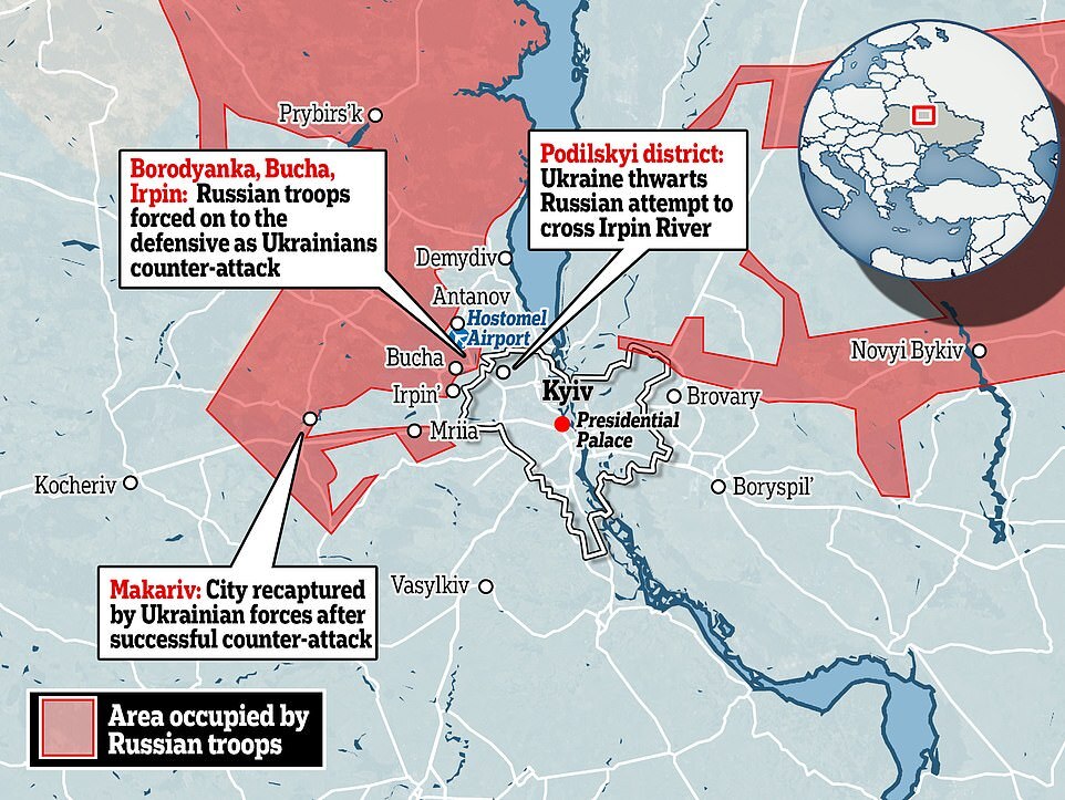 It came as Pentagon officials said Russia is shelling Ukraine with dozens of rockets each day in a 'near-desperate' attempt to swing the tide of war in their favour and gain leverage in negotiations. British intelligence says the Russian advance in Kyiv has stalled, and is actually being repulsed in areas to the north-west.