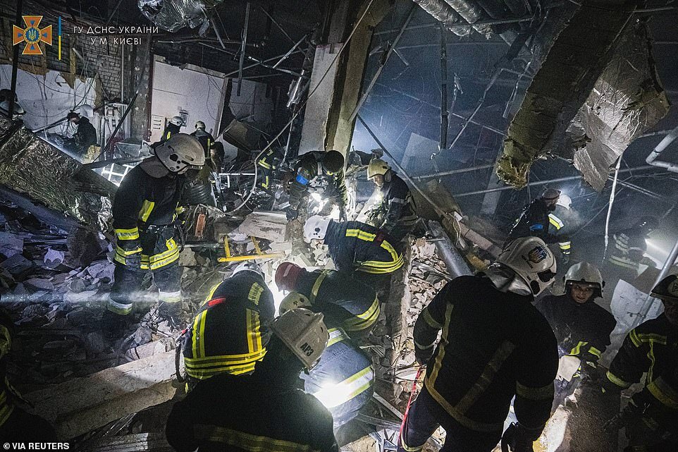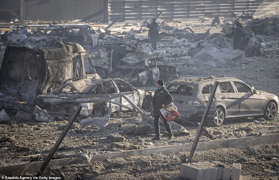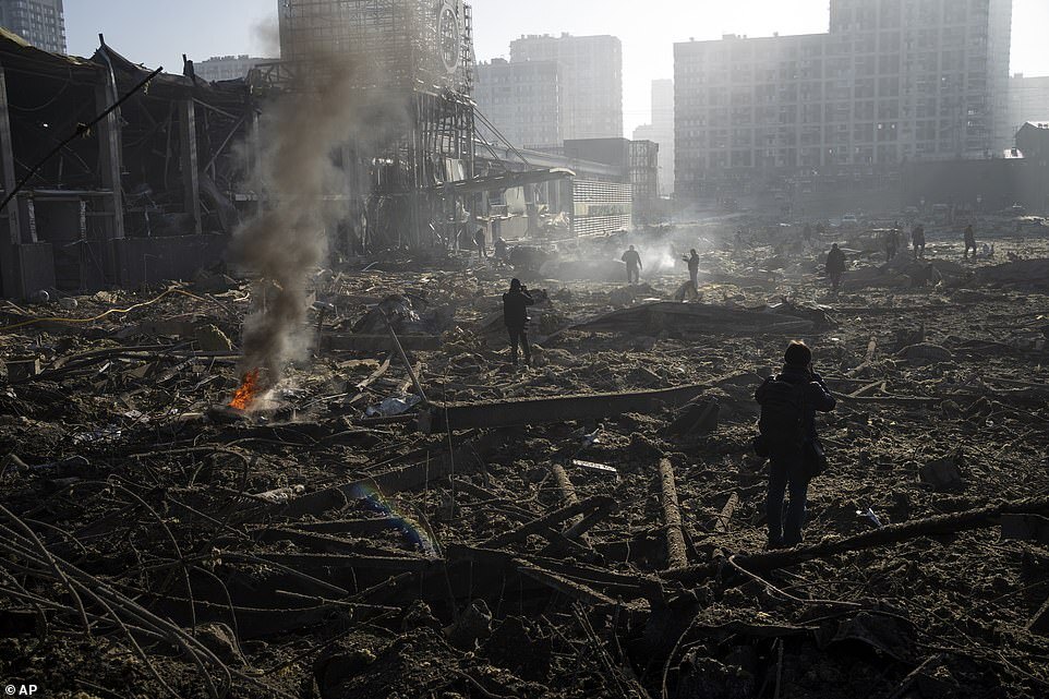 Moment Kyiv shopping mall is reduced to rubble by a Russian missile leaving at least eight dead as Putin's men step up their shelling of cities in a 'near-desperate attempt to turn the war in their favour'