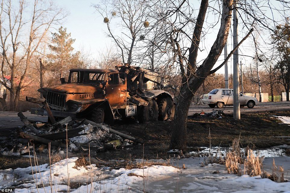 Shortcomings by military planners have left Russian convoys vulnerable to Ukrainian ambushes which has deprived troops of the resources they need to fight (pictured, a destroyed truck near the city of Kharkiv)