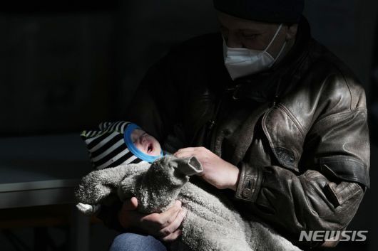 [로마=AP/뉴시스]22일(현지시간) 이탈리아 로마에서 우크라이나 르비우에서 온 한 난민이 아기를 안고 있는 모습. 2022.03.22.