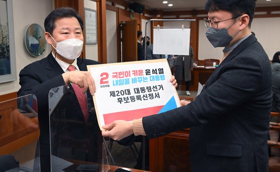 제20대 대통령 선거 후보 등록 첫날인 2월 13일 경기도 과천시 중앙선거관리위원회에서 국민의힘 윤석열 후보의 대리인인 이철규 전략기획부총장이 후보 등록 서류를 제출하고 있다. 연합뉴스