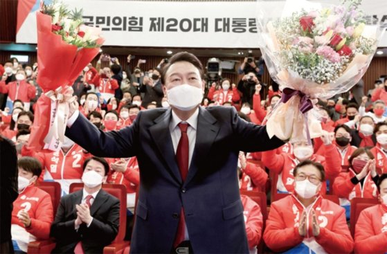 윤석열 대통령 당선인이 3월 10일 새벽 국민의힘 개표상황실을 찾아 꽃다발을 받은 뒤 취재진을 향해 포즈를 취하고 있다.