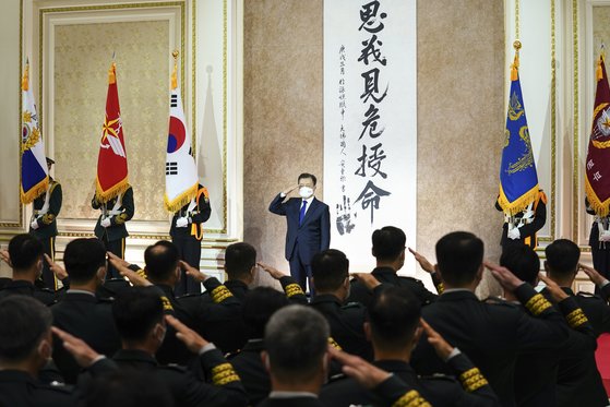 문재인 대통령이 지난해 11월 16일 청와대 영빈관에서 열린 준장 진급자 삼정검 수여식에서 진급자들의 경례를 받고 있다. 이날 육군 50명, 해군 11명, 해병대 3명, 공군 12명 등 76명의 준장 진급자들이 삼정검을 받았다. 청와대사진기자단