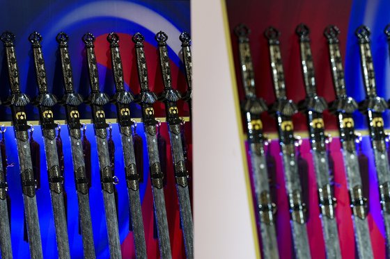 지난해 11월 16일 청와대 영빈관에서 열린 삼정검 수여식에서 준장 진급자에게 수여된 삼정검. 청와대사진기자단