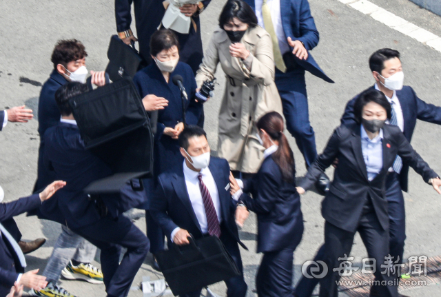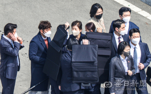박근혜 전 대통령이 24일 오후 대구 달성군 유가읍 사저 앞에 도착해 대국민 메시지를 발표 하는 가운데 한 남성이 소주병을 투척하자 경호원들이 박 전 대통령을 보호하기 위해 주변을 에워싸고 있다. 김영진 기자 kyjmaeil@imaeil.com