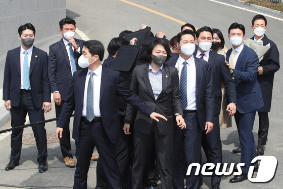 (대구=뉴스1) 공정식 기자 = 박근혜 전 대통령이 24일 오후 대구 달성군 유가읍 쌍계리 사저 앞에 도착해 차량에서 내려 대국민 메시지를 발표하는 도중 한 남성이 소주병 던지며 소동을 일으키자 경호원들의 경호를 받고 있다. 2022.3.24/뉴스1