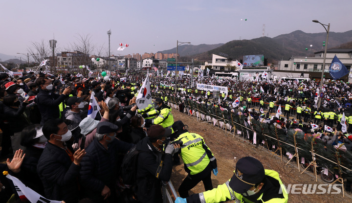 [대구=뉴시스] 이영환 기자 = 박근혜 전 대통령이 탑승한 차량이 24일 오후 대구 달성군 유가읍 박 전 대통령 사저에 도착하자 시민들이 환호하고 있다. 2022.03.24. 20hwan@newsis.com