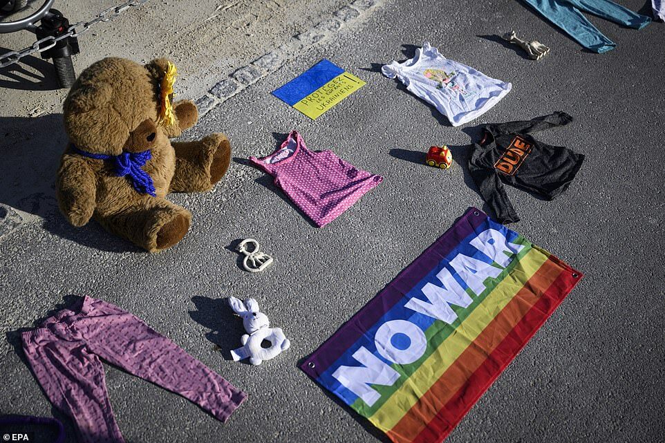 GENEVA: Children's clothes, plush toys and a peace flag lay on the ground during a demonstration against the Russian invasion of Ukraine in front of the Permanent Mission of the Russian Federation to the United Nations in Geneva, Switzerland