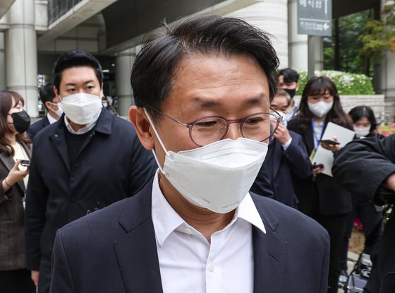 뇌물수수 혐의로 고위공직자범죄수사처(공수처)에서 '1호'로 기소된 김형준 전 부장검사가 22일 오전 서울 서초구 서초동 서울중앙지법에서 1심 첫 공판을 마치고 법원을 빠져 나가고 있다. 이 사건은 공수처가 설립 이래 처음으로 기소권을 행사한 사안으로, 법정에도 공수처 검사들이 직접 출석해 공소 유지를 맡았다. 김 전 부장검사는 2015년 서울남부지검 증권범죄합동수사단 단장으로 근무하던 시절 옛 검찰 동료였던 박모 변호사의 자본시장법 위반 사건이 합수단에 배당되자 사건 처리와 관련해 1093만원가량의 금품과 향응 접대를 받은 혐의를 받고 있다. 김 전 부장검사는 2016년 10월 스폰서 김모 씨로부터 금품·향응을 받은 이른바 '스폰서 검사' 사건으로 구속기소 돼 대법원에서 징역 1년에 집행유예 2년을 확정받은 바 있다. 연합뉴스