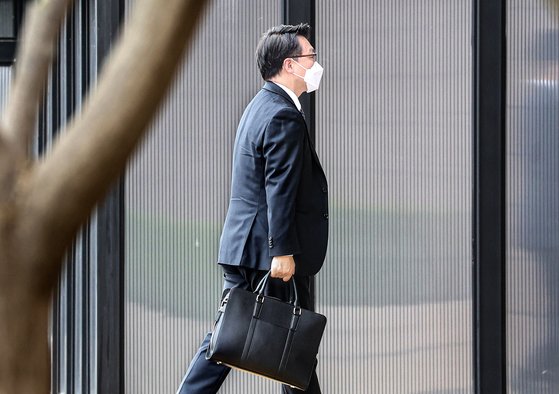 제20대 대통령직인수위원회와 고위공직자범죄수사처(공수처)와의 간담회가 예정된 지난달 30일 오전 김진욱 공수처장이 30일 오전 경기도 과천 정부과천청사 내 사무실로 출근하고 있다. 연합뉴스