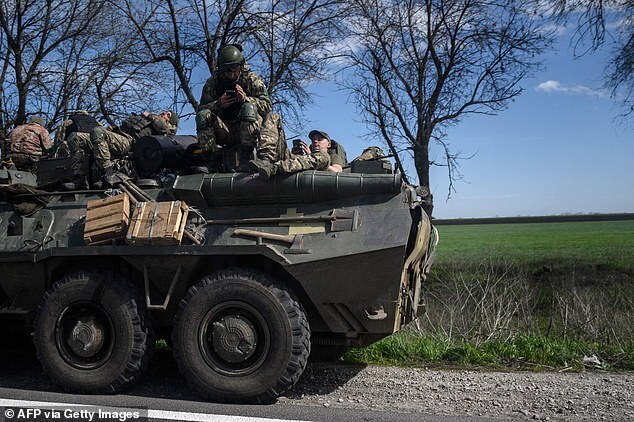 Ukrainian servicemen rest on an armoured personnel carrier as they make their way along a highway on the outskirts of Kryvyi Rih