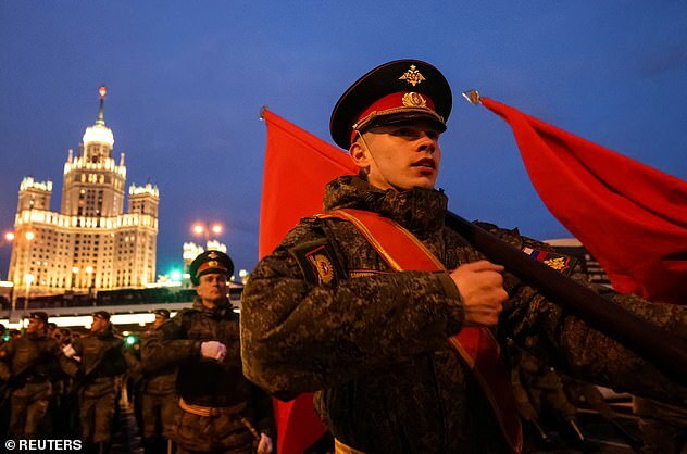Britain's Defence Secretary Ben Wallace said that the Russian president might use Russia's victory day parade on May 9 to announce the mass mobilisation of his reserves for a final push in Ukraine. Pictured: Russian military vehicles take part in a rehearsal of Victory Day military parade marking the 77th anniversary of the end to World War 2, at Red Square in Moscow, Russia on April 28, 2022
