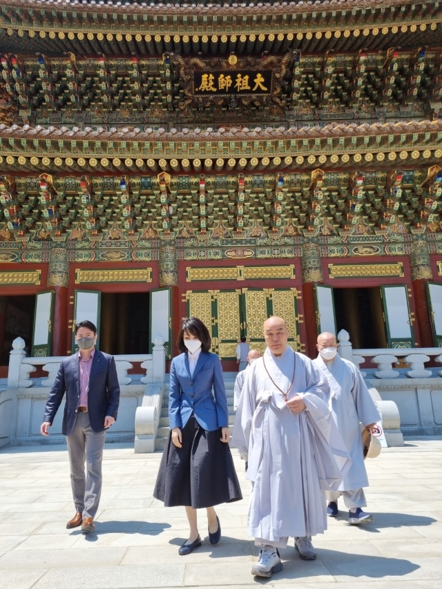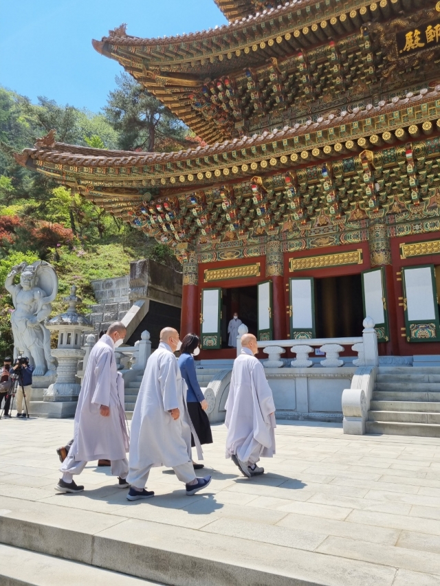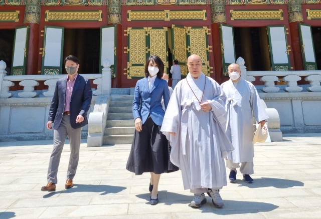 차에서 내린 김 여사는 부장 승려 6명과 함께 법당에 들어가 10분가량 참배하고 나왔다.