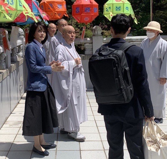차담을 마친 김 여사는 총무원 마당에서 총무원장과 다른 부장 승려 등 사찰 관계자들과 기념촬영을 하고 점심식사까지 마친 뒤 오후 2시쯤 구인사를 떠났다.