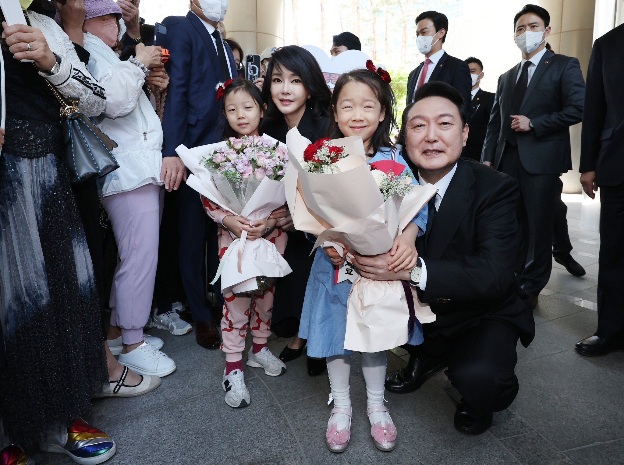 윤석열 대통령 부부가 10일 오전 제20대 대통령 취임식에 참석하기 위해 서울 서초구 서초동 자택을 나서며 어린이들로부터 꽃다발을 받은 뒤 기념촬영을 하고 있다.연합뉴스