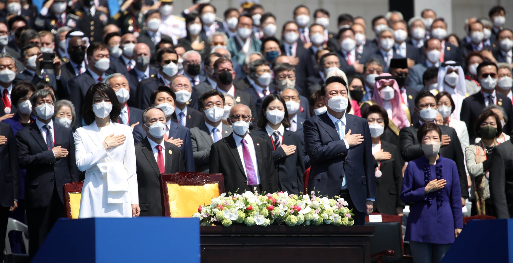 윤석열 대통령이 10일 서울 여의도 국회의사당 앞 잔디마당에서 열린 제20대 대통령 취임에서 참석 내빈과 함께 국민의례를 하고 있다. 국회사진기자단