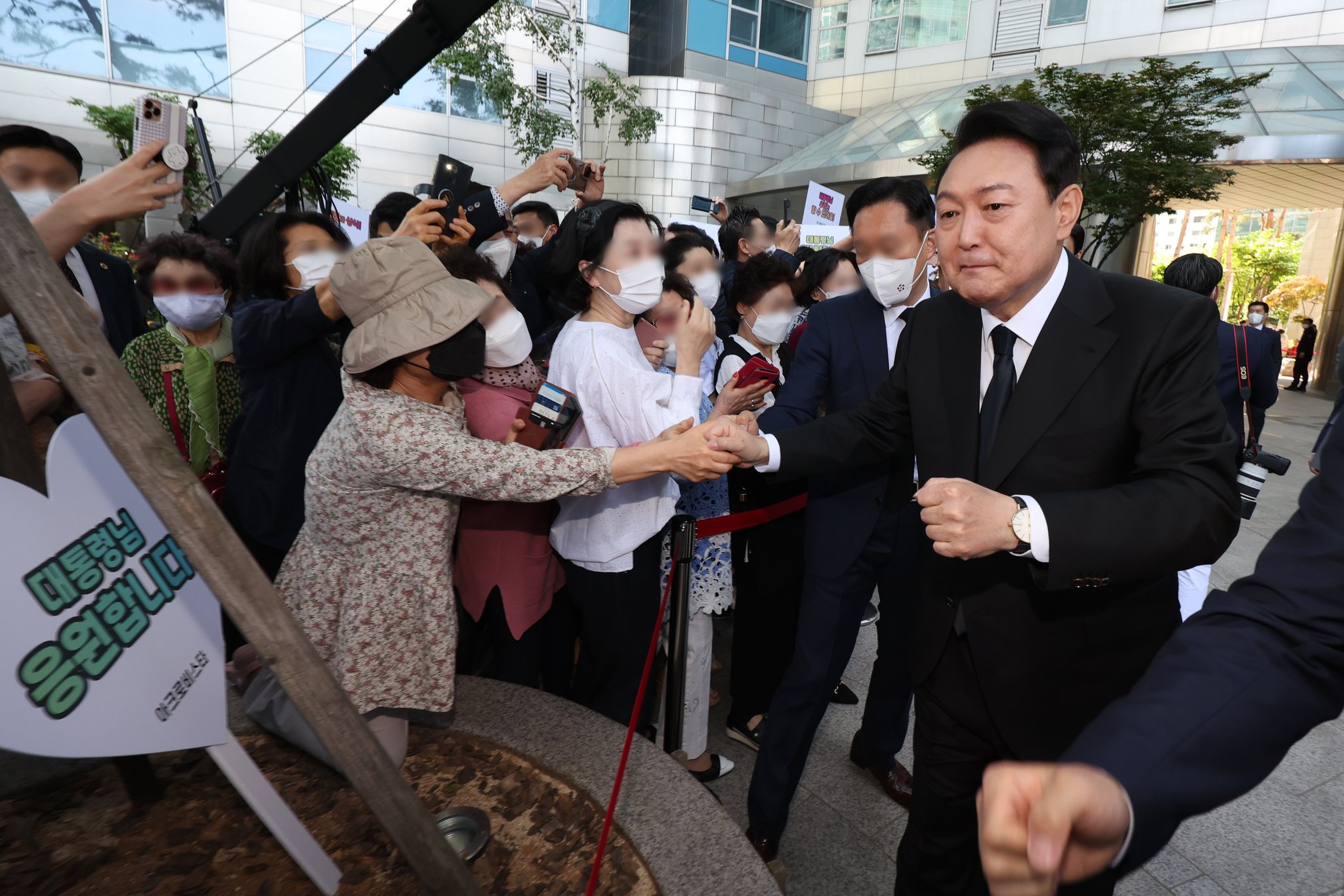 기사 링크 복사 버튼윤 대통령 내외, 업무 시작 전 지역주민과 만남..."잘 부탁드립니다"