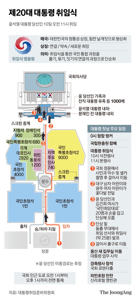 윤석열 대통령이 오늘(10일) 0시 서울 용산 대통령 집무실 국가위기관리센터(지하벙커) 상황실에서 국군통수권을 이양받는 것으로 제20대 대통령 임기를 시작했다. 윤 대통령은 김건희 여사와 함께 국립현충원 참배 후 국회로 이동, 오전 11시 취임식에 참석했다. 윤 대통령은 취임사를 통해 “자유, 인권, 공정, 연대의 가치를 기반으로 국민이 진정한 주인인 나라,국제사회에서 책임을 다하고 존경받는 나라를 위대한 국민 여러분과 함께 반드시 만들어 나갈 것” 이라고 약속했다. 윤 대통령 취임식 하루를 라이브로 업데이트한다.