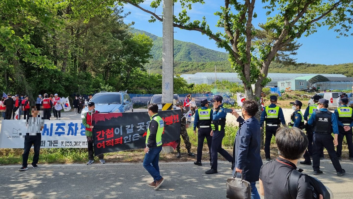 반면 문 전 대통령의 귀향을 반대하는 단체 회원들의 집회도 잇따랐다. 이들은 평산마을 외곽에서 문 전 대통령을 비난하는 내용이 담긴 현수막과 태극기를 들고 반대 목소리를 높였다. 한 회원은 “코로나 방역, 부동산, 원전 등 지난 5년 간 문 전 대통령의 국정 운영은 한참 잘못됐다”고 말했다.