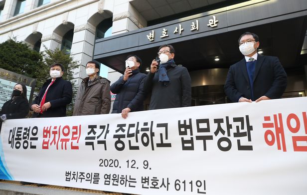 한반도 인권과 평화통일을 위한 변호사모임(한변) 소속 변호사들이 윤석열 검찰총장 징계위원회를 하루 앞둔 9일 오전 서울 서초구 서울지방변호사회관 앞에서 기자회견을 열고 전국 변호사 611인의 서명을 받은 '대통령은 법치유린 즉각 중단하고 추미애 법무부 장관을 해임하라'는 내용의 연서명문을 발표하고 있다. 2020.12.09/뉴시스