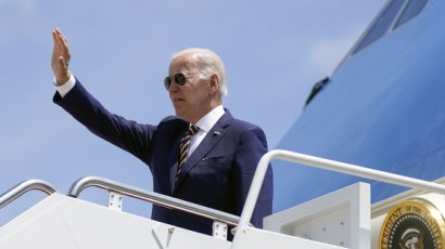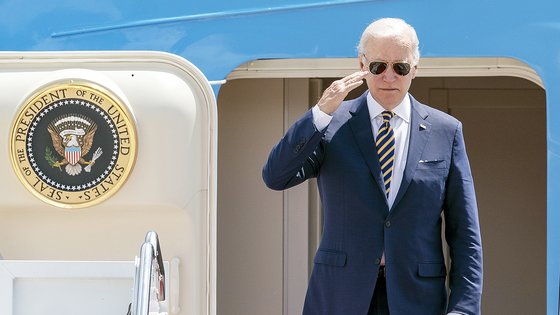 조 바이든 미국 대통령이 19일(현지시간) 한국 방문을 위해 에어포스원에 탑승하고 있다. AP=연합뉴스