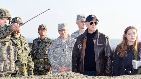 2013년 12월 7일 당시 조 바이든 미국 부통령이 손녀 피너건과 함께 판문점 인근 올렛초소(GP)를 방문해 JSA경비대대 소대장으로부터 비무장지대(DMZ) 경계태세에 대해 브리핑을 받고 있다. 사진공동취재단