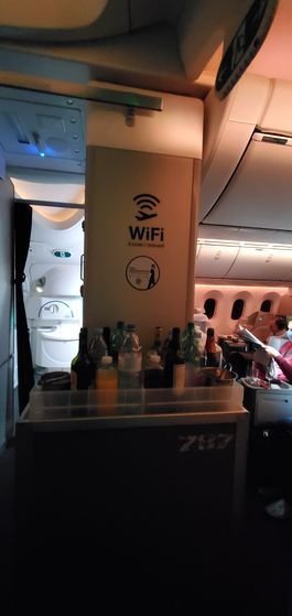 조 바이든 미국 대통령의 취임 후 첫 아시아 순방에 함께하는 백악관 미디어 전세기 실내 모습. 와이파이 서비스가 된다고 표시돼 있는데, 고장을 일으켜 15시간 비행시간 내내 먹통이었다. 백악관 전세기=박현영 특파원