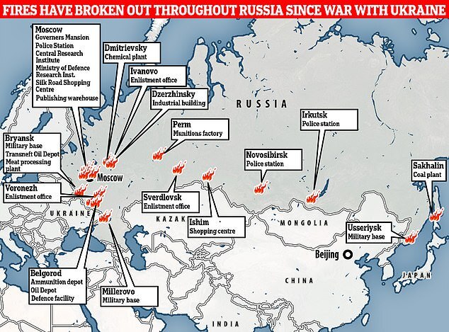The map shows possible incidents of sabotage in Russia which have broken out since the start of the war in Ukraine