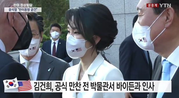 흰색 투피스 정장 차림에 올림머리를 한 김 여사는 바이든 대통령과 간단한 인사를 나눈 뒤, 함께 박물관 내부를 관람했다.