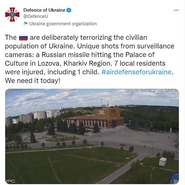 Ukraine's Defence Ministry tweeted a video showing the Palace of Culture being blown up in Lozova, Kharkiv (Pictured: Tweet which shows the centre in the moments before it was destroyed)