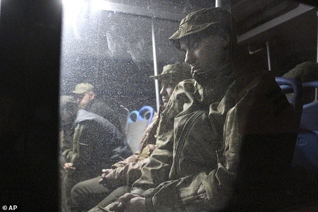 Ukrainian servicemen sit in a bus after they left the besieged Mariupol's Azovstal steel plant, and are evacuated to Russian-held territory in Donetsk