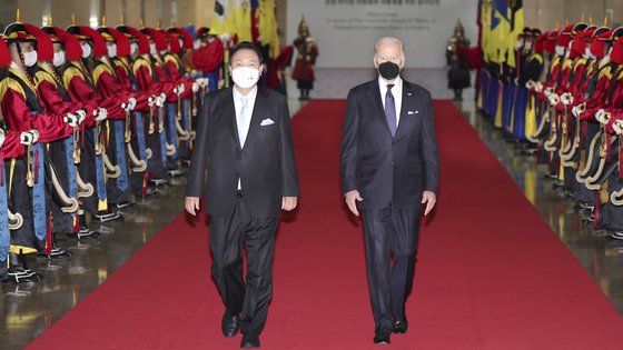 윤석열 대통령과 조 바이든 미국 대통령이 21일 오후 서울 용산구 국립중앙박물관에서 열린 한미정상 환영만찬에 입장하고 있다. 강정현 기자