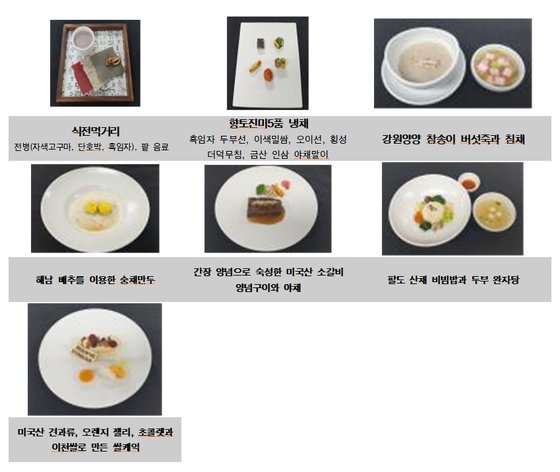 식전 먹거리로는 자색 고구마ㆍ단호박ㆍ흑임자 맛의 전병과 팥 음료가 나왔다. ▶향토진미 5품 냉채(흑임자 두부선ㆍ이색밀쌈ㆍ오이선ㆍ횡성 더덕무침ㆍ금산 인삼 야채말이) ▶강원 양양 참송이 버섯죽과 침채 ▶해남 배추를 이용한 숭채만두 ▶간장 양념으로 숙성한 수비드(저온 진공 조리법) 방식의 미국산 소갈비 양념구이와 야채 ▶팔도 산채 비빔밥과 두부 완자탕 순으로 테이블에 올랐다. 만찬주는 미국 나파밸리 와인인 샤또 몬텔레나와 바소 카베르네쇼비뇽, 국산 스파클링 와인인 ‘오미로제 결’이 제공됐다.