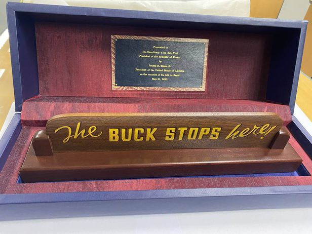 22일 오후 취임 후 첫 한국 방문을 마치고 일본으로 떠난 조 바이든 미국 대통령이 윤석열 대통령에게 이런 문구가 적힌 패를 선물했다고 대통령실이 밝혔다. 해리 트루먼(1884~1972) 미국 33대 대통령이 재임 중 자기 집무실 책상 위에 놓아뒀던 패를 본 딴 패였다고 한다. 백악관 나무를 소재로 장인이 손으로 깎은 패라고 한다.