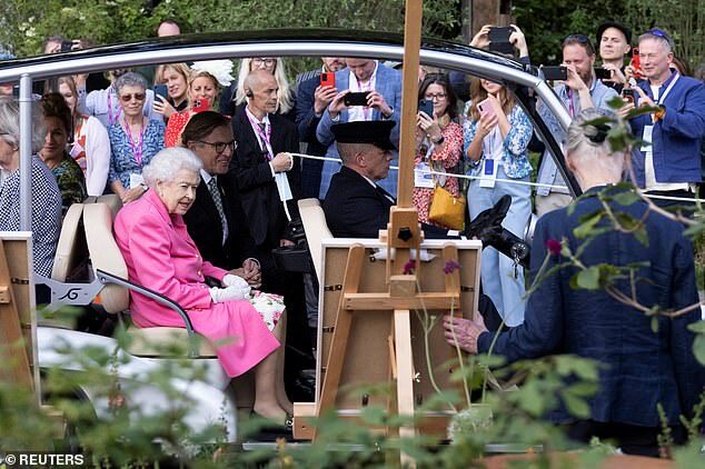 The Queen enjoyed looking at the beautiful displays at Chelsea Flower Show while being given a tour by Keith Weed, the President of the Royal Horticultural Society while sat on her buggy