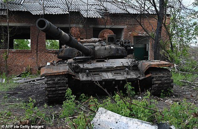 A destroyed Russian tank is seen in a village to the north of Kharkiv after the area was recaptured by Ukrainian forces