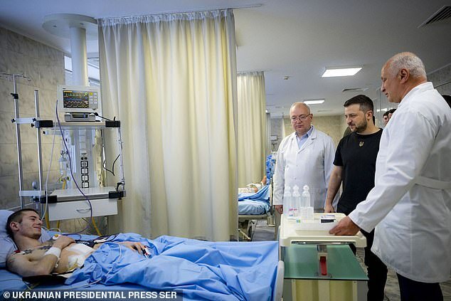 Ukrainia's President Volodymyr Zelensky (2ndR) visiting a wounded Ukrainian serviceman at the Shalimov National Institute of Surgery and Transplantology in Kyiv, on the 100th day of the Russian invasion of Ukraine, June 3