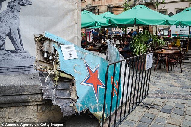 Wing from a downed Russian plane near a hidden fountain in Lviv, Ukraine on June 4, 2022