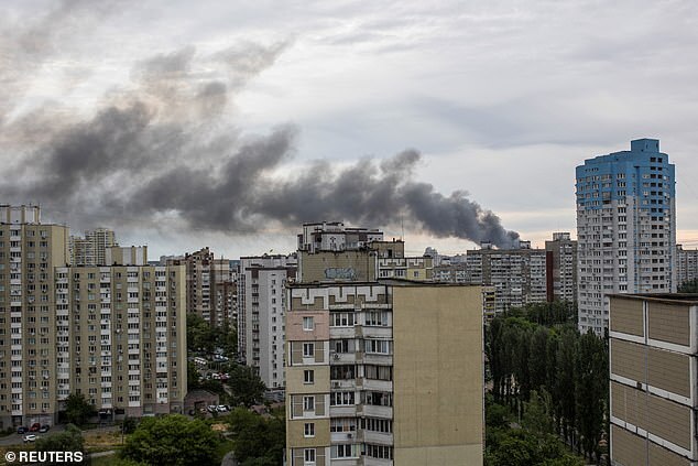 A barrage of Russian missiles struck Kyiv early Sunday, the first major strikes to hit Ukraine's capital in more than a month. Pictured: Smoke rises after missile strikes, as Russia's attack on Ukraine continues, in Kyiv, Ukraine June 5, 2022