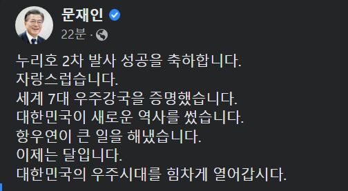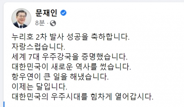 누리호 발사 성공 직후 문재인이 남긴 SNS 글.