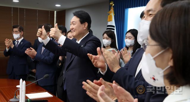 (서울=뉴스1) 오대일 기자 = 윤석열 대통령이 21일 용산 대통령실 청사 영상회의실에서 이종호 과학기술정보통신부 장관으로부터 누리호(KSLV-Ⅱ) 2차 발사 결과를 영상으로 보고받은 후 박수치고 있다. 대통령실사진기자단 2022.6.21/뉴스1