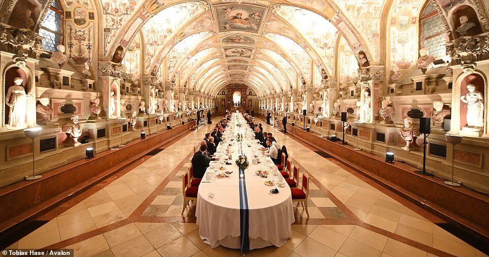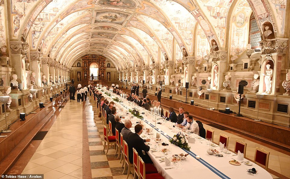 World leaders last night agreed a new 'surge' to defeat Vladimir Putin in Ukraine after the Kremlin bombed Kyiv while the G7 met. Pictured: G7 guests sit together at the table during a reception in the Antiquarium of the Residenz last night
