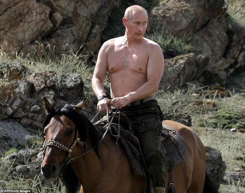 And in a moment of light-heartedness yesterday, the leaders sat together and joked about the Russian leader's fondness of being photographed without a shirt on. PIctured: Vladimir Putin's famous horse riding pose