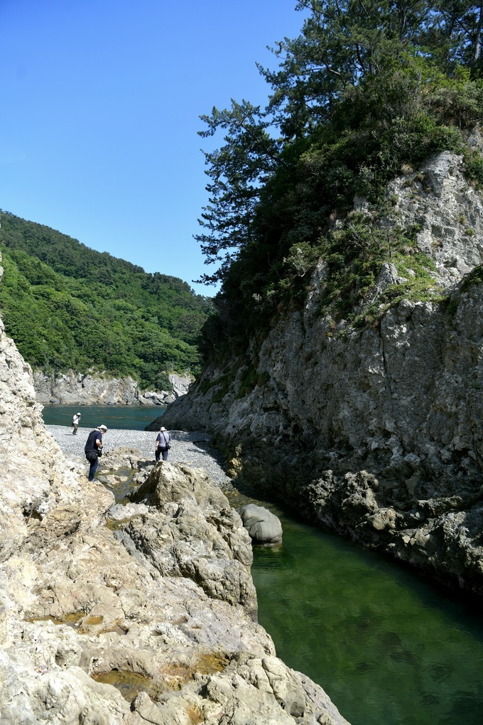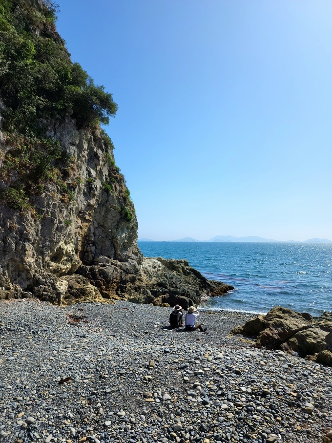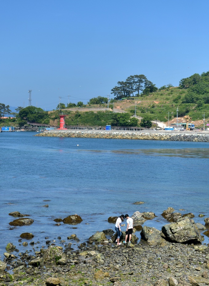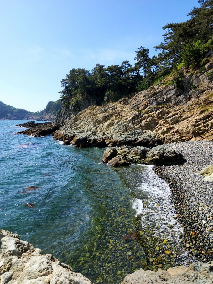 오른쪽으로 시선을 돌리면 몽돌해변이 끝나는 곳에 작은 협곡이 보인다. 오랜 지각활동은 기암괴석 절벽과 그 사이로 넘실대는 푸른 바다가 어우러지는 비경을 만들어 놓았다. 안으로 좀 더 들어가면 또 다른 숨겨진 몽돌해변과 그 너머로 연대도·만지도의 해안선이 하나의 섬처럼 이어지는 풍경이 등장한다. 작은 몽돌해변으로 직접 이어지는 길이 없어 다시 돌아 나와 반대쪽 계단으로 내려가야 한다. 폭은 좁지만 해송이 자라는 수직 절벽과 기암괴석에 둘러싸인 몽돌해변이 연인들에게 둘만의 은밀한 시간을 선사한다.