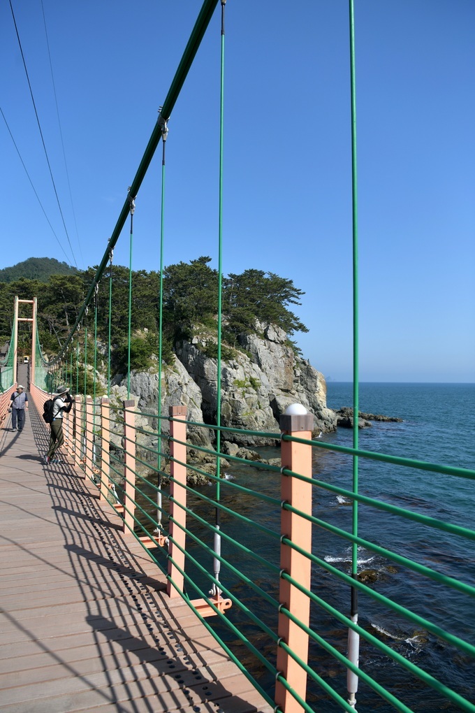 풍란과 돈나무가 펼쳐지는 해안데크 풍란향기길을 10여분 걸으면 저 멀리 연대도로 이어지는 출렁다리가 아찔하게 바다 위에 떠 있다. 아주 많이 출렁거리는데 중간쯤에서 저절로 멈추게 된다. 기암괴석이 펼쳐지는 연대도 해안 절벽과 푸른 바다, 바로 앞의 섬 내부지도가 어우러지는 절경 때문에 발을 뗄 수가 없다. 하지만 연대도 절경은 이제 시작이다.