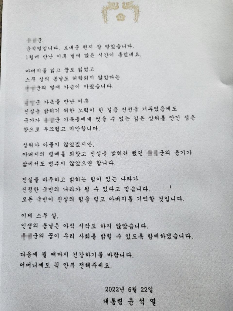 유족 측이 29일 공개한 편지에서 윤 대통령은 “국가가 깊은 상처를 안긴 점은 참으로 부끄럽고 미안하다”라고 위로했다.