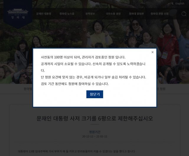 문재인 대통령의 퇴임 후 사저 넓이를 ‘6평’(약 19.835㎡)으로 제한해달라는 청와대 국민청원이 올라와 화제가 된 가운데, 해당 글은 청와대 국민청원 게시판에서 돌연 비공개 처리됐다.